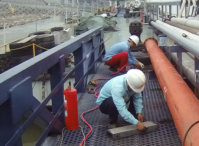 物流公司監(jiān)利油庫(kù)碼頭輸油管線管托移位,機(jī)修人員與油庫(kù)人員對(duì)其進(jìn)行復(fù)位焊接,確保油庫(kù)卸油安全。