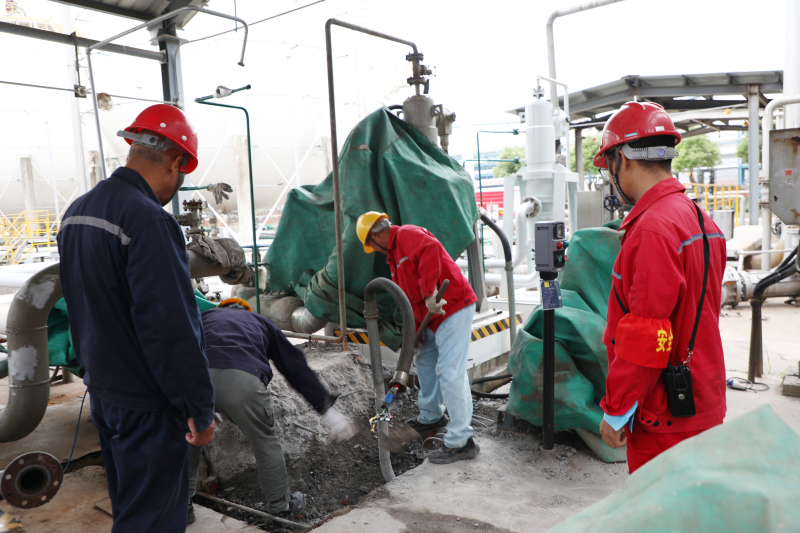 油品一車間副主任周志幫對(duì)液化氣泵房C4泵基礎(chǔ)改造施工作業(yè)進(jìn)行安全監(jiān)護(hù)。